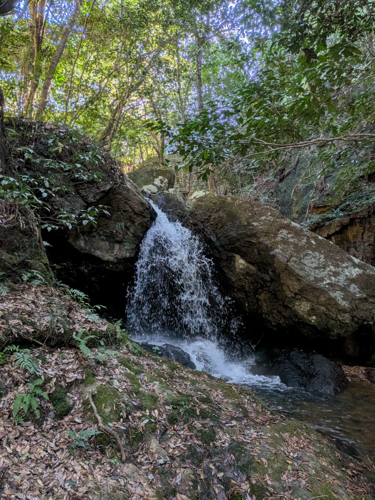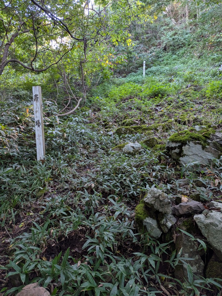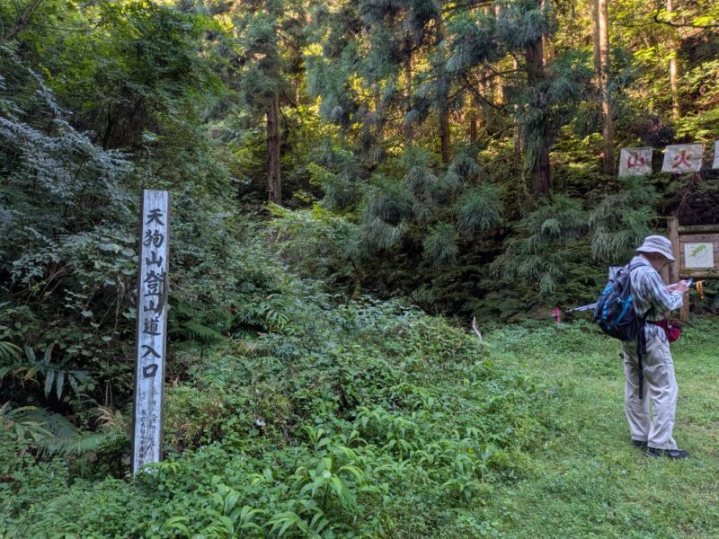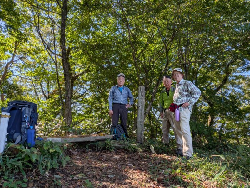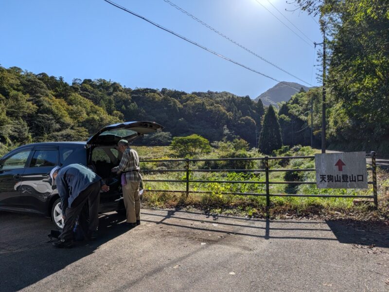 秋晴れのもと、三人で天狗山を歩きました。天狗山登山口の駐車場に車を停め、登山道入口まで約30分道路を歩きました。そこからいよいよ狭い急登が始まります。何度か川を渡り進むと足場の悪いガレ場や滑りやすい道が続きます。斎場跡を過ぎると程なく標高610mの山頂です。風も強くなく暖かい山行でした。昼食は下山後、滝のそばで食べました。