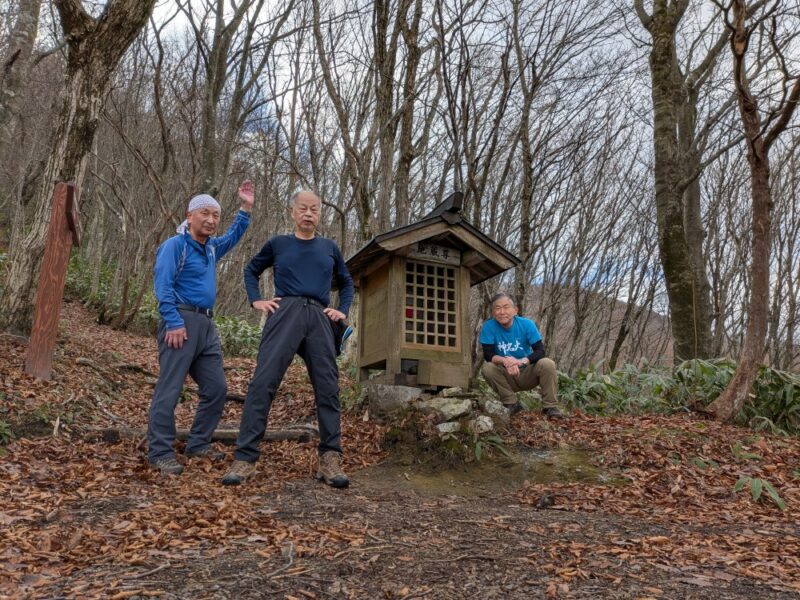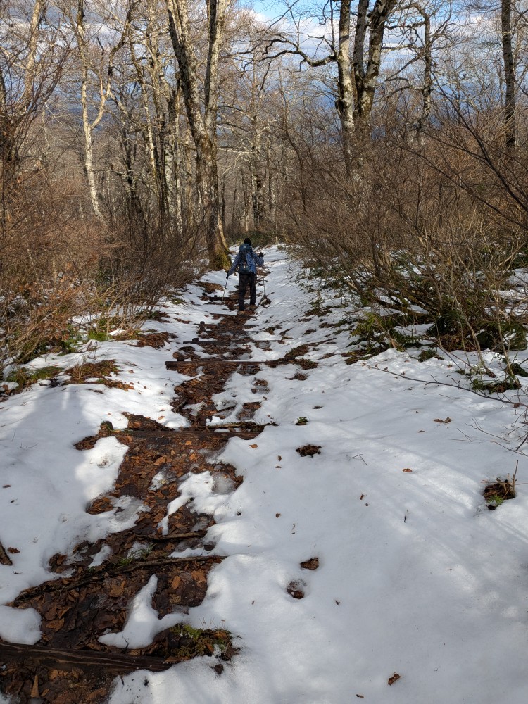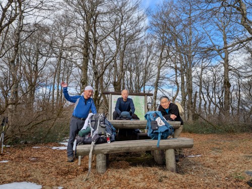 三人で大万木山に行きました。気温は低かったが風が無かったので歩き安かった。山頂近くの道端には雪があった。日当り良好の山頂のベンチで昼食を食べました。誰にも会いませんでした。スプレーを持参したけど熊もいませんでした。