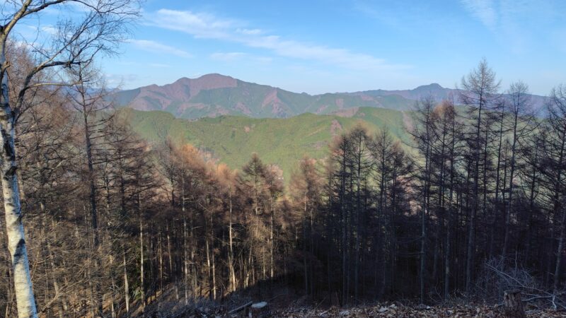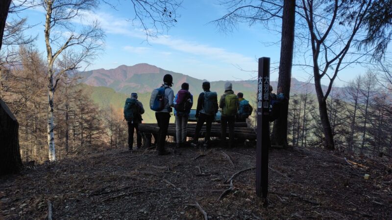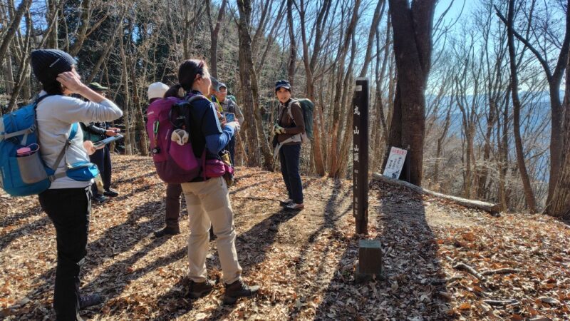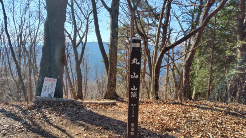 武蔵五日市駅駐車場8:05〜30→武蔵五日市駅8:35〜9:06→バス→笛吹入口(571m 10:00)→丸山(1098m昼食11:46〜12:30)→笛吹峠12:40→笹尾根→分岐、笹ヶタワノ峰(1121m 12:50)→大羽根山(992m 13:35〜40)→浅間尾根登山口(620m 14:20〜14:52)→バス→武蔵五日市駅15:48→武蔵五日市駅駐車場15:50