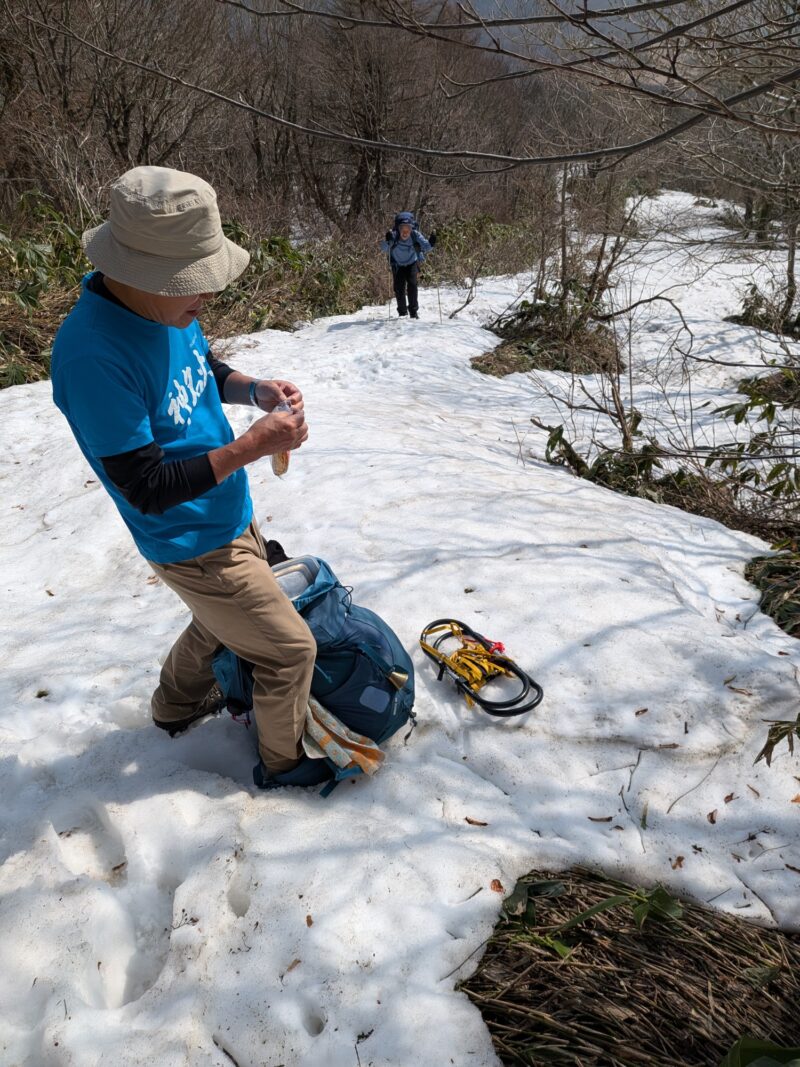 三人で吾妻山へ行って来ました。大峠に駐車し、林道を歩き大膳原経由で山頂へ。残雪が無いため直登は断念し、通常の登山道を歩きましたが所々残雪がありました。晴れて雲一つ無い天気で風も無く楽しい山行でした。昼食は避難小屋で食べました。